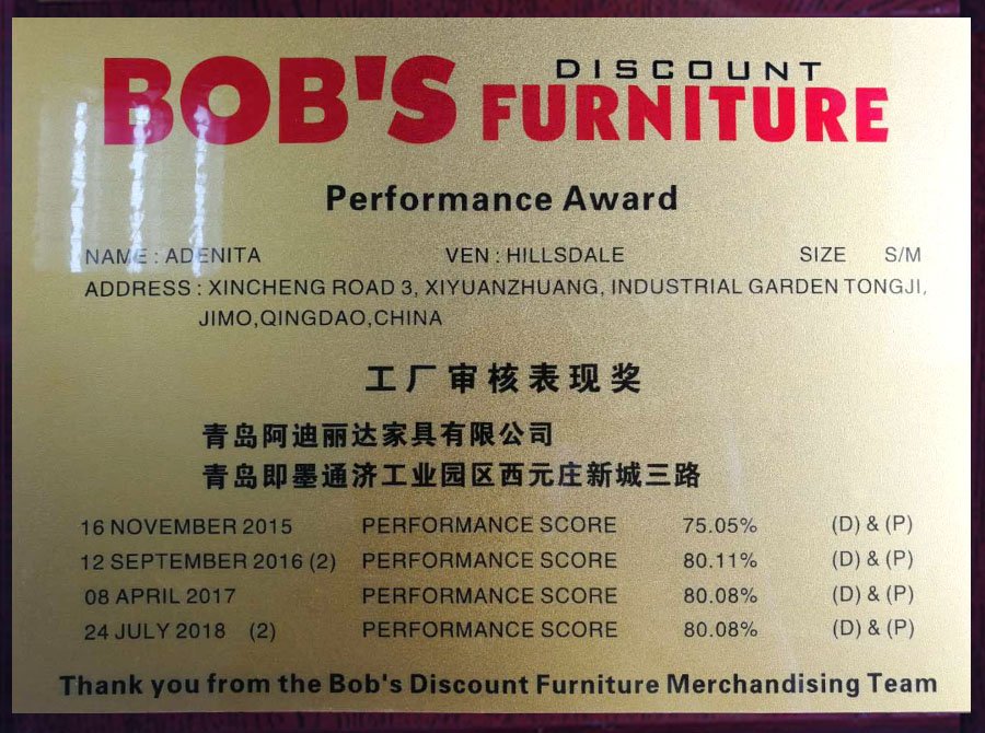 Passed BOB'S FURNITURE factory inspection audit for four consecutive years 01